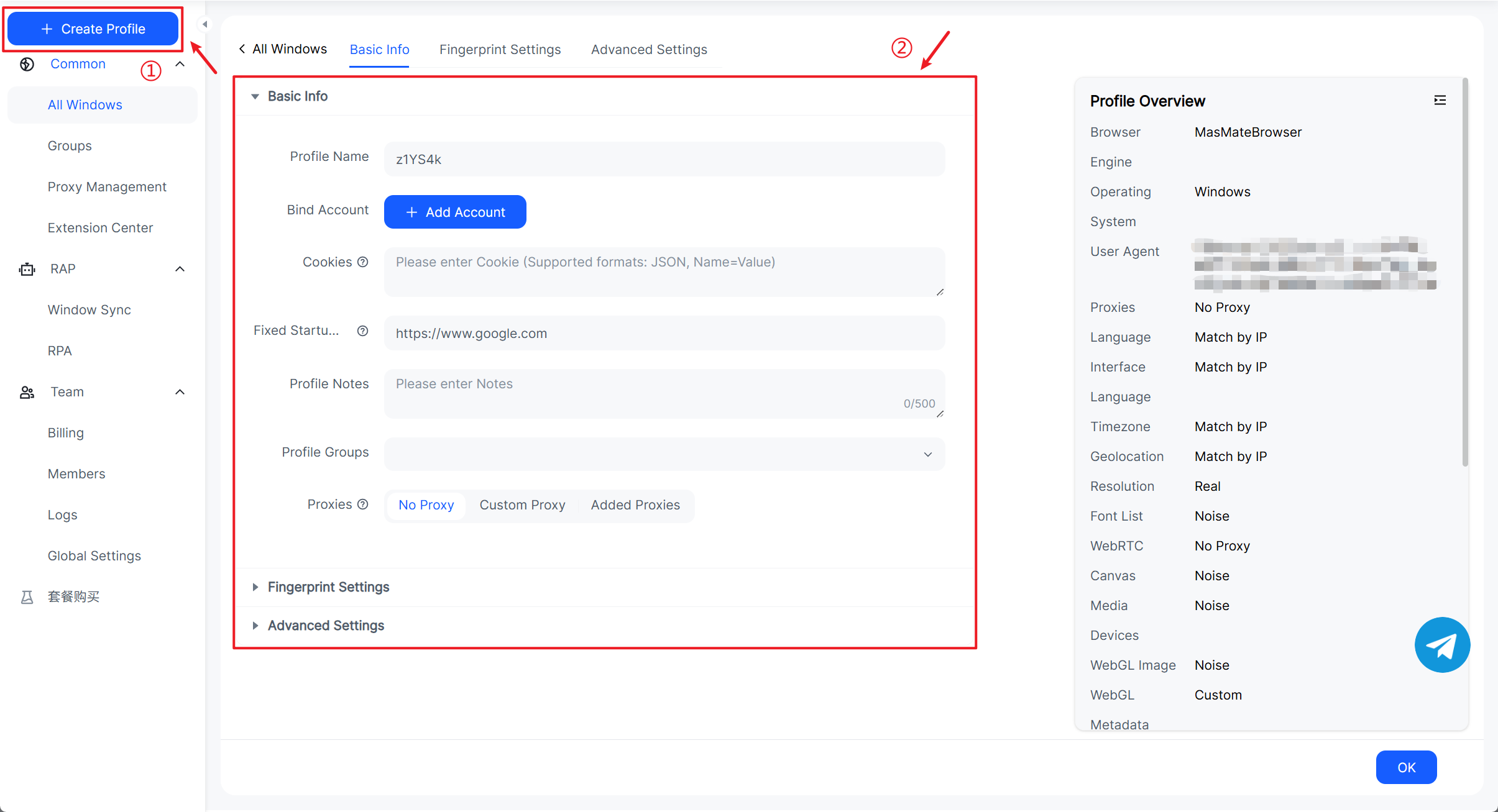 - ใน MasLogin ไปที่ All Windows แล้วคลิก Create Profile ตั้งชื่อเช่น