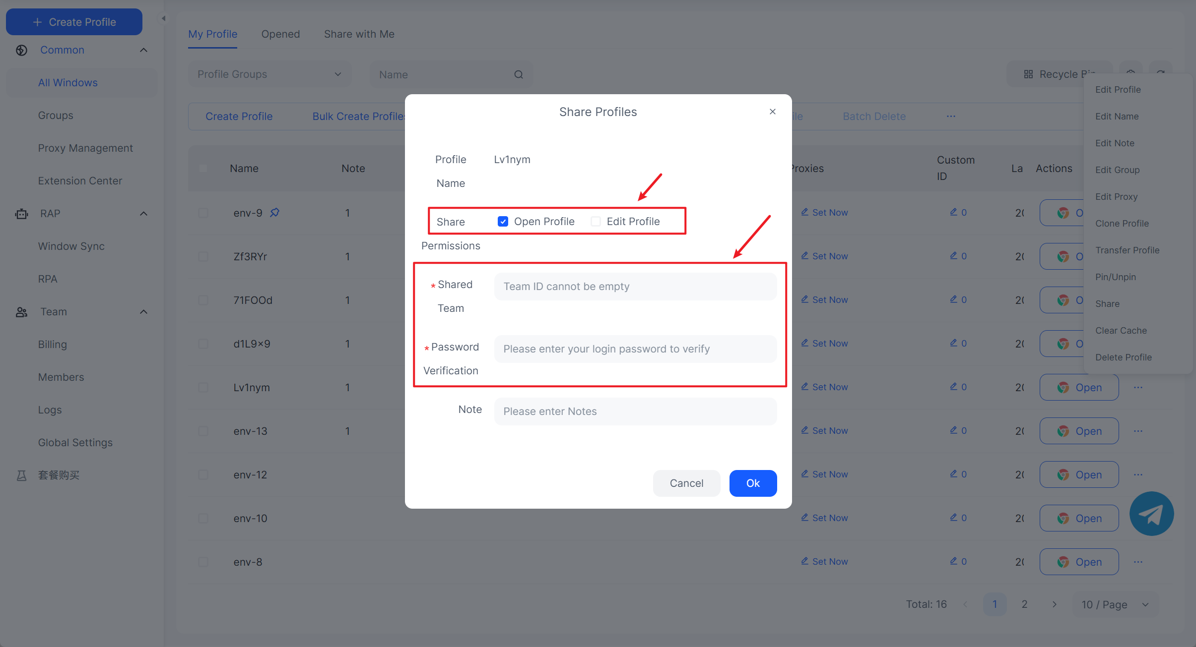 - กรอก Shared Team (ดูได้จากด้านบนของแอปฝั่งผู้รับ) ผ่าน การยืนยันรหัสผ่าน (รหัสผ่านบัญชีปัจจุบันของคุณ) และใส่บันทึกประกอบถ้าจำเป็น