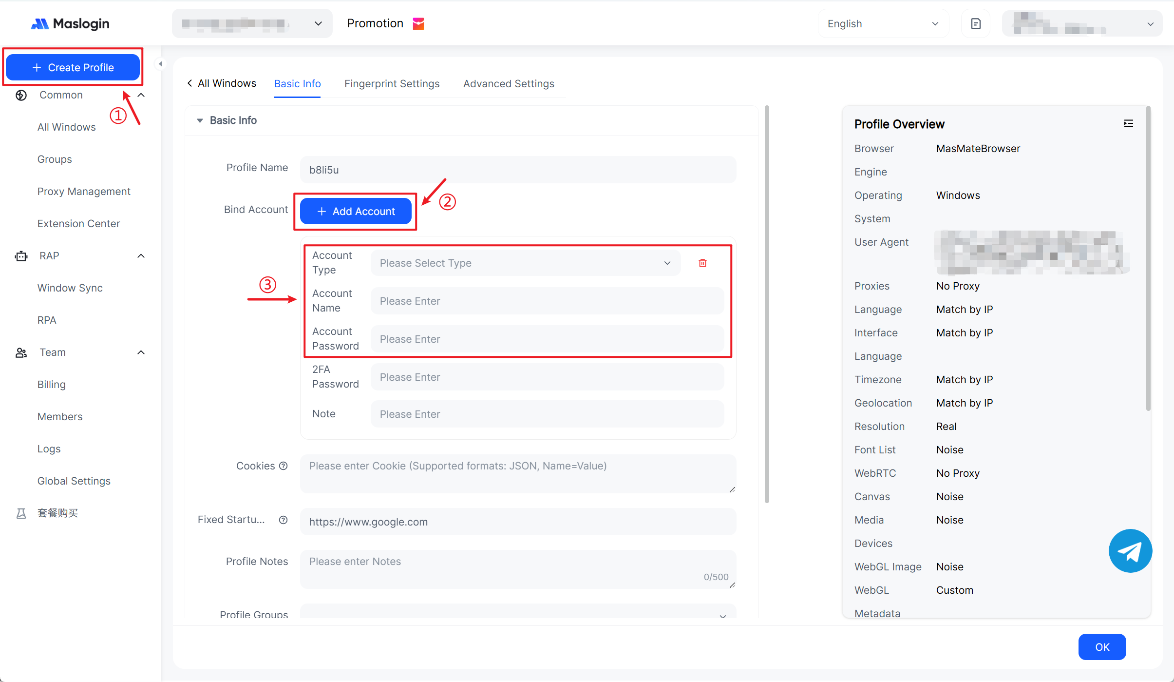 2. ที่มุมซ้ายบน คลิก Create Profile เพื่อสร้างสภาพแวดล้อมเบราว์เซอร์แยก ใน Basic Info คลิก Add Account เลือก LinkedIn และกรอกข้อมูลบัญชี