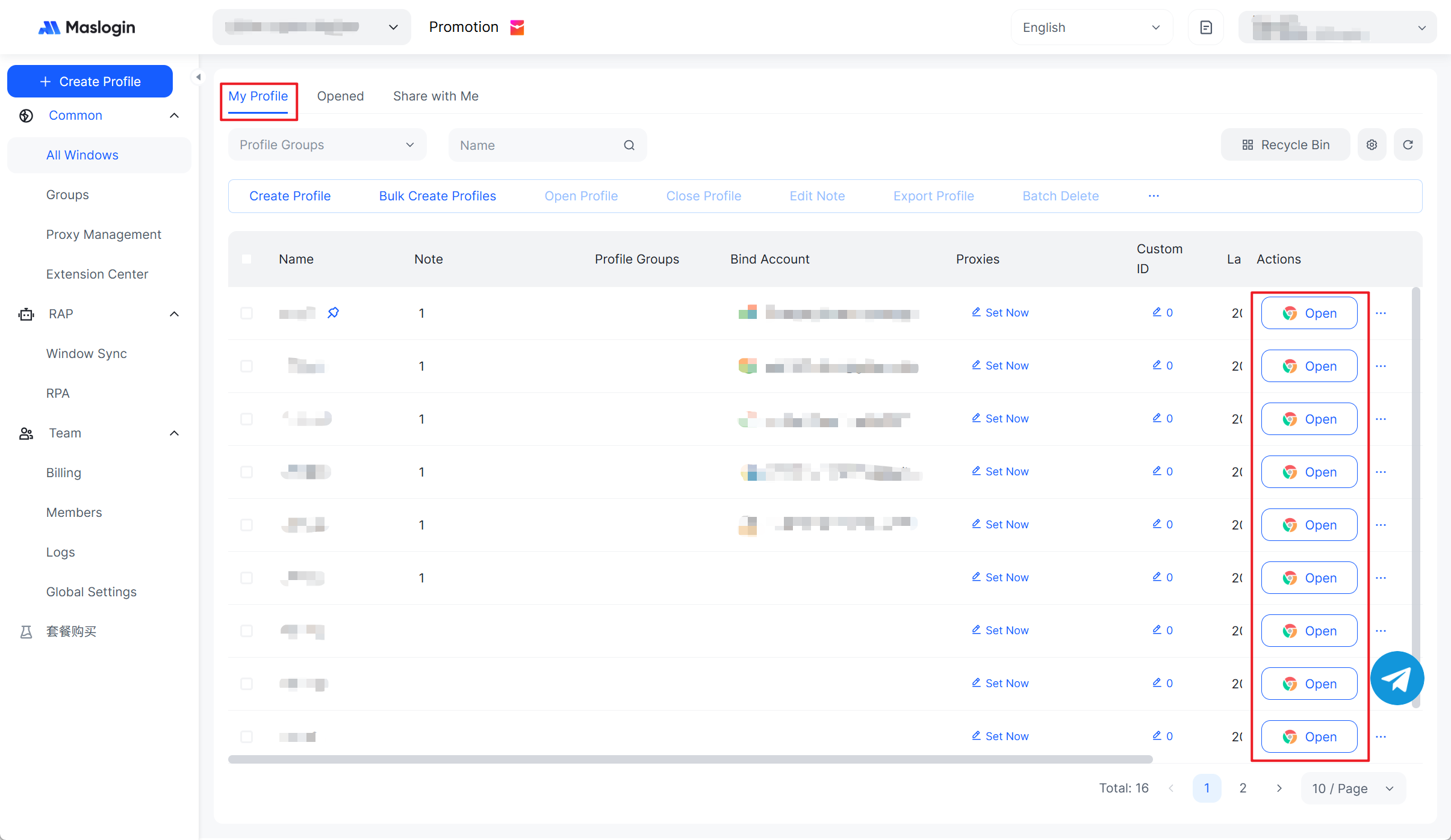 3. เพิ่มบัญชีเสร็จ ไปที่ All Windows › My Profile ค้นหาสภาพแวดล้อมที่มีบัญชีนั้น แล้วคลิก Open เพื่อเริ่ม