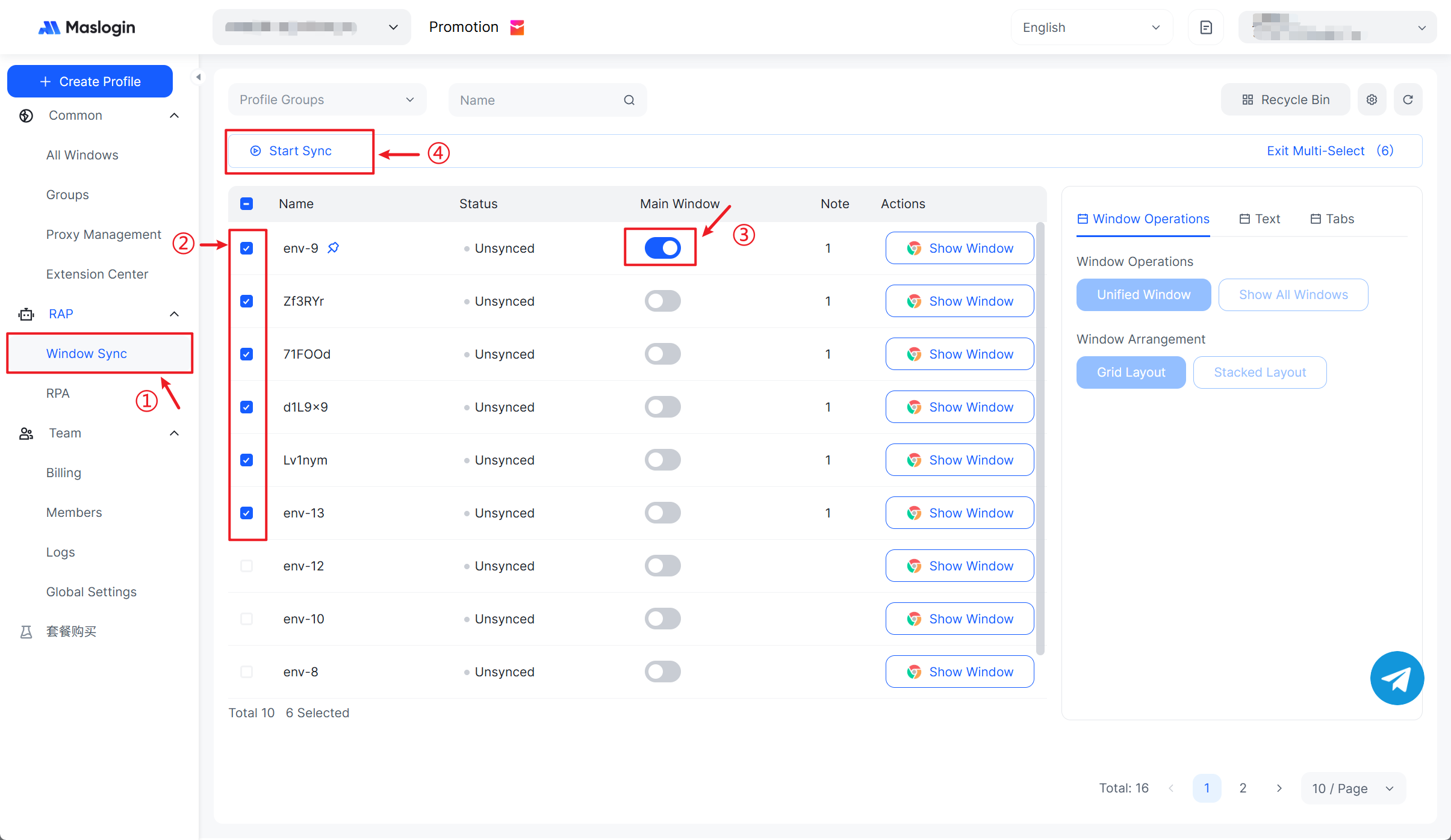 4. ต้องดูแลหลายบัญชีพร้อมกัน ให้เปิด Windows Sync ติ๊กสภาพแวดล้อมที่ต้องการ เลือกหนึ่งอันเป็น Main Windows แล้วคลิก Start Sync ก็จะควบคุมหลายบัญชี LinkedIn พร้อมกันได้อย่างปลอดภัย