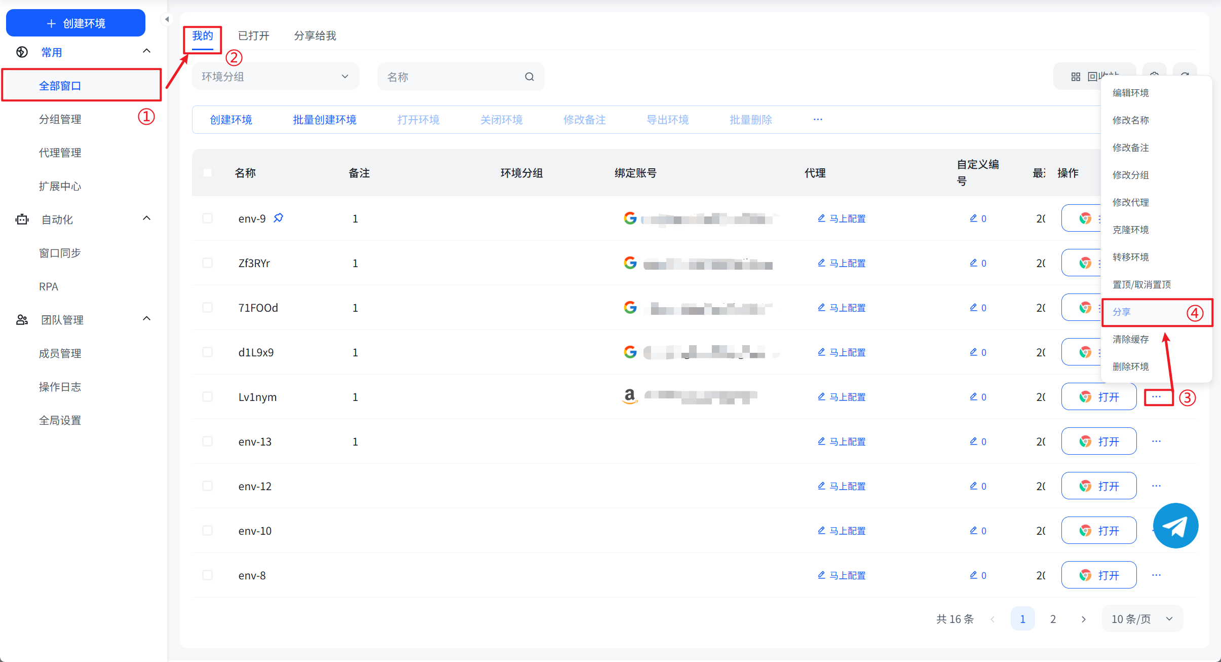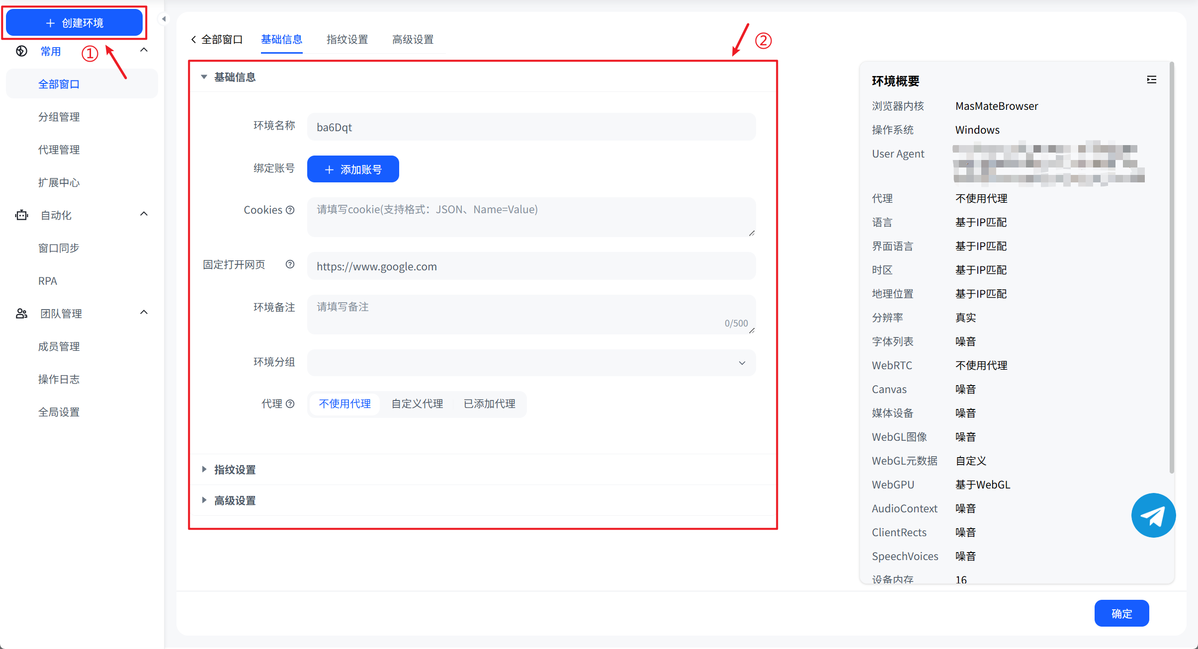 - 在 MasLogin 的【全部窗口】里点击创建环境,命名如