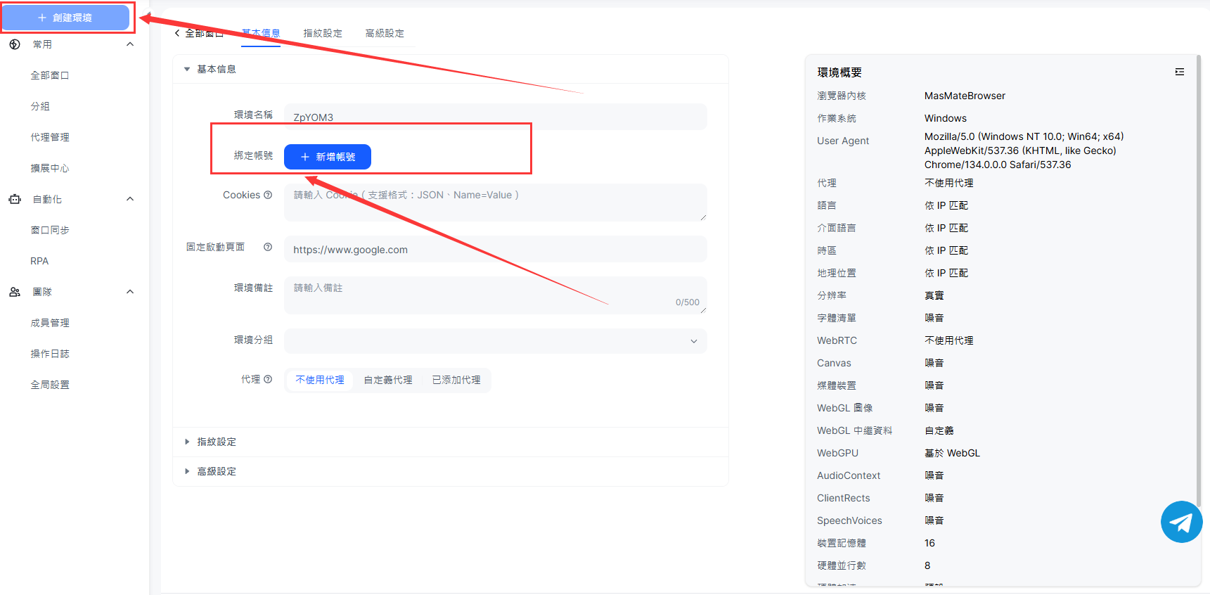 每個環境代表一個店舖,包含獨立 Cookie、指紋與地理 IP。
