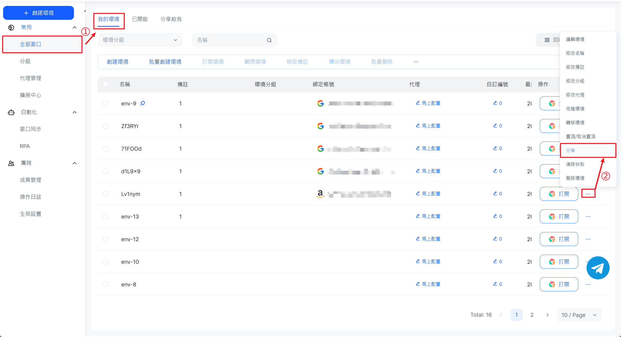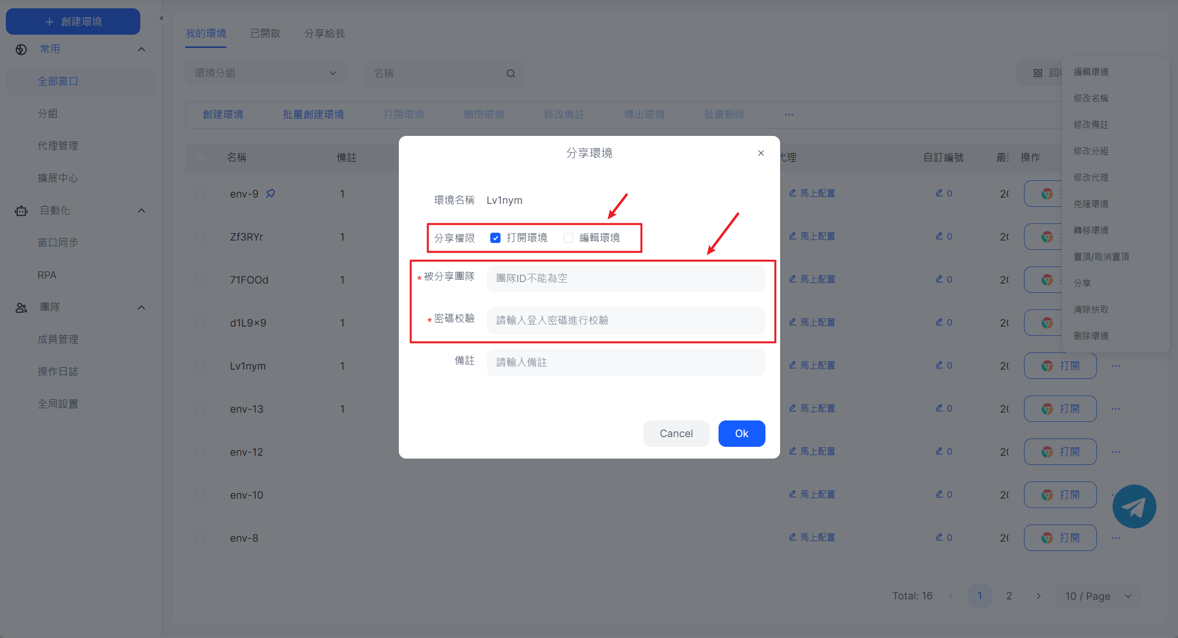 - 確認後發送;對方在【分享給我】即可看到並開啟該環境;同時在【我的】處也可使用分享的環境。