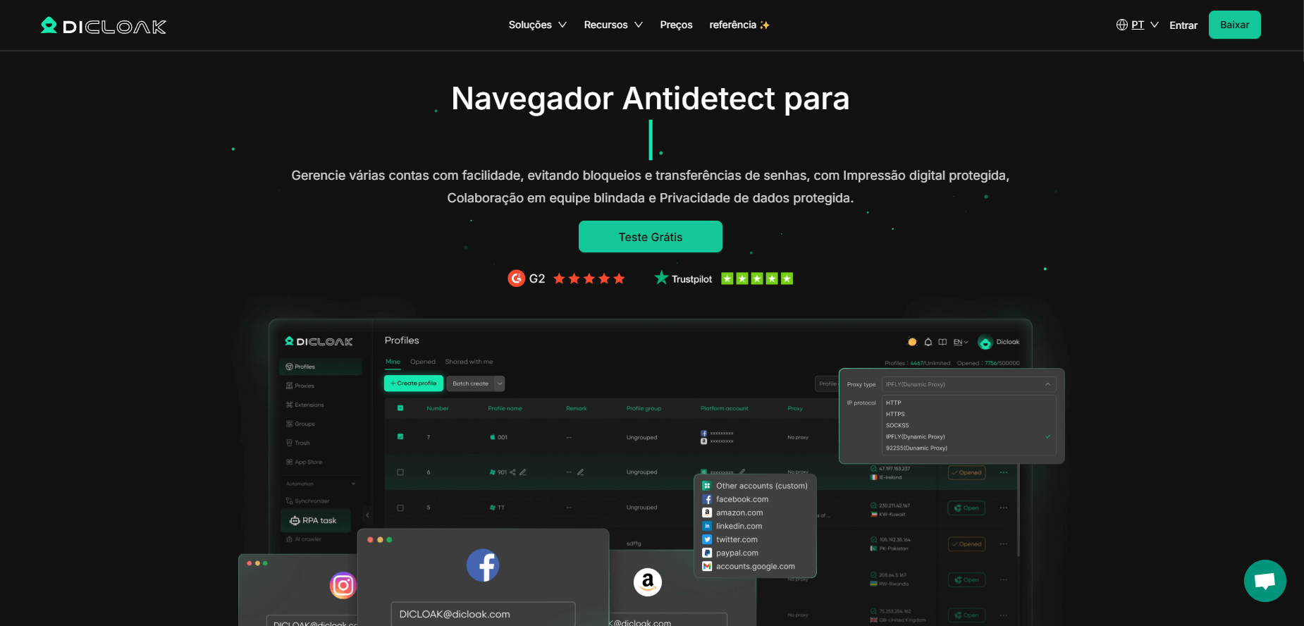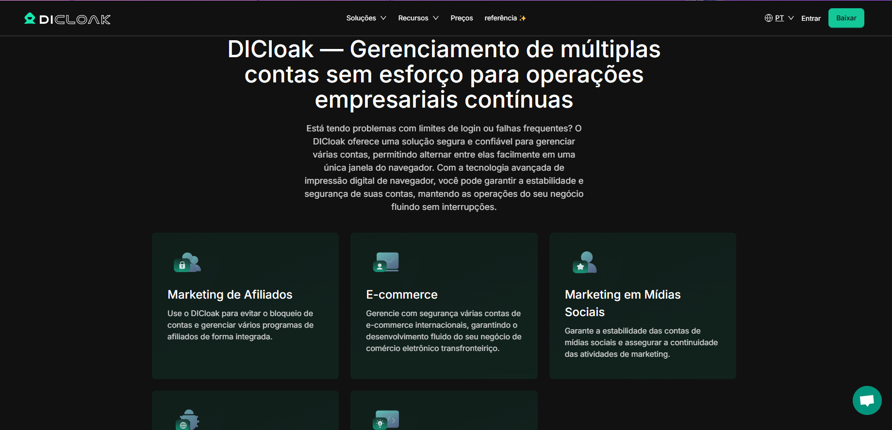 Em resumo, o DICloak é uma solução profissional de navegador anti-associação. Seja você gestor de mídias sociais, vendedor de e-commerce ou anunciante, ele permite administrar e operar múltiplas contas com segurança e eficiência.