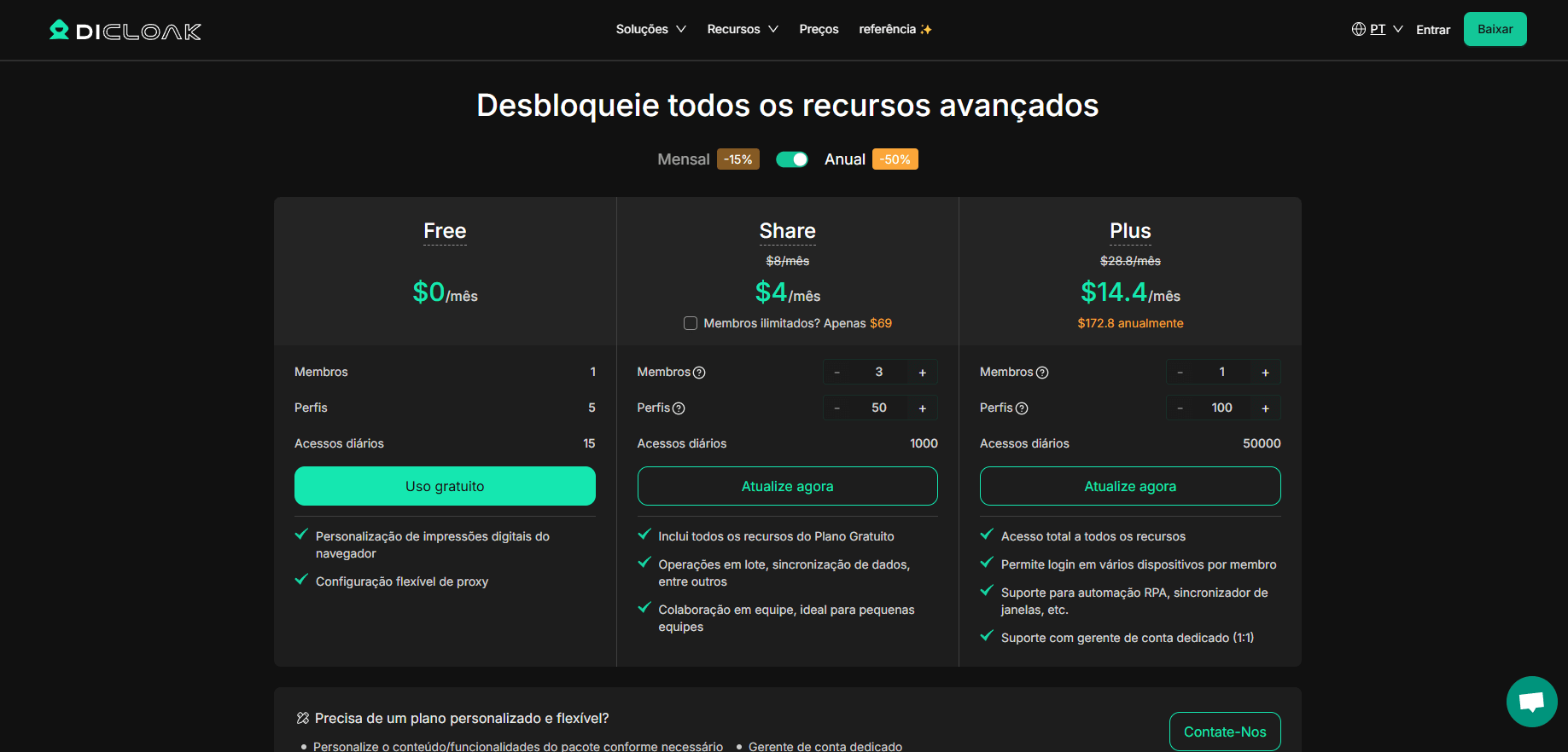 Além do isolamento básico de múltiplas contas, o DICloak oferece gestão de proxies, colaboração em equipe, automação (RPA) e integração via API, o que o torna adequado não apenas para usuários individuais, mas também para grandes equipes que precisam trabalhar de forma colaborativa.